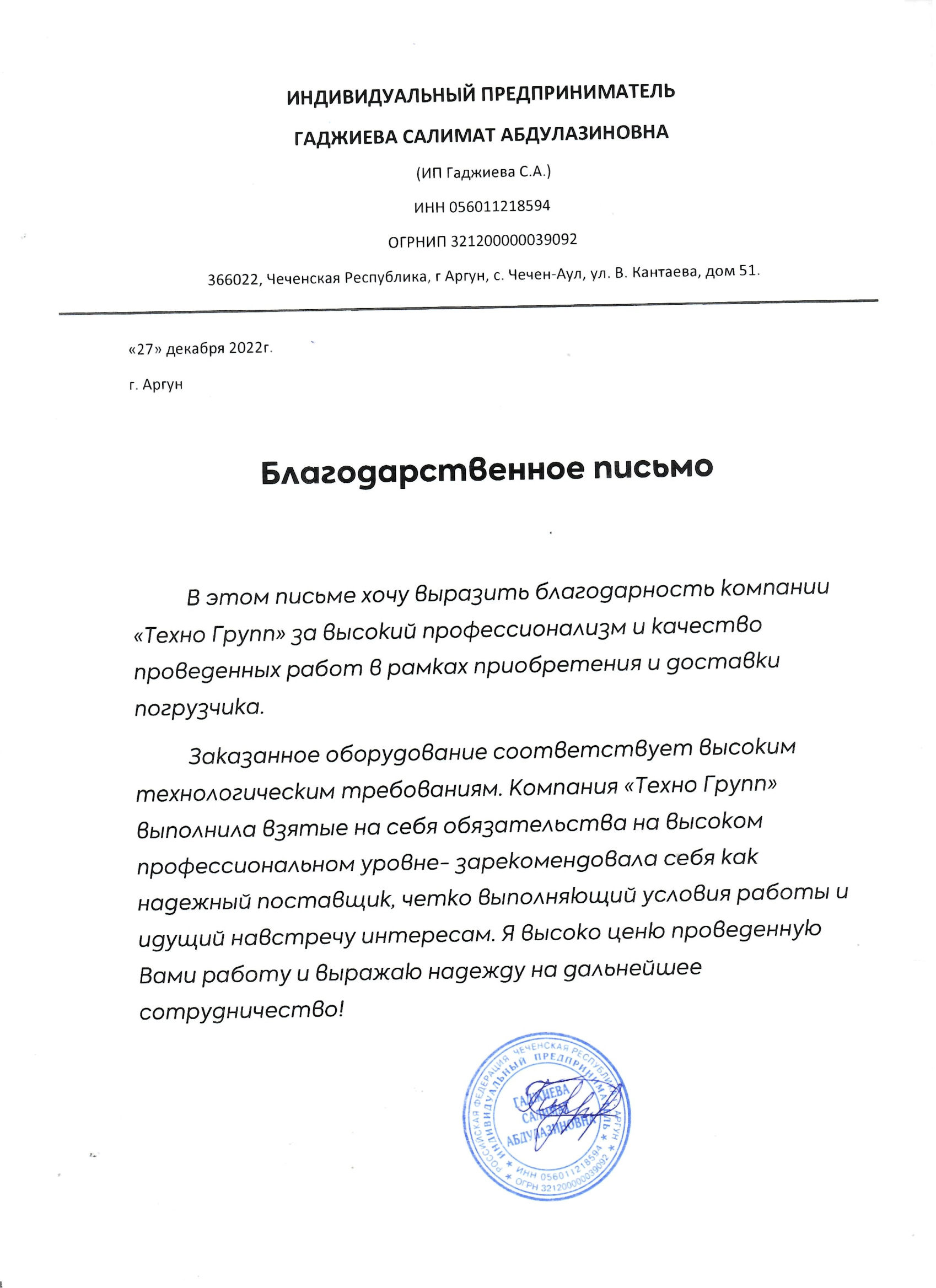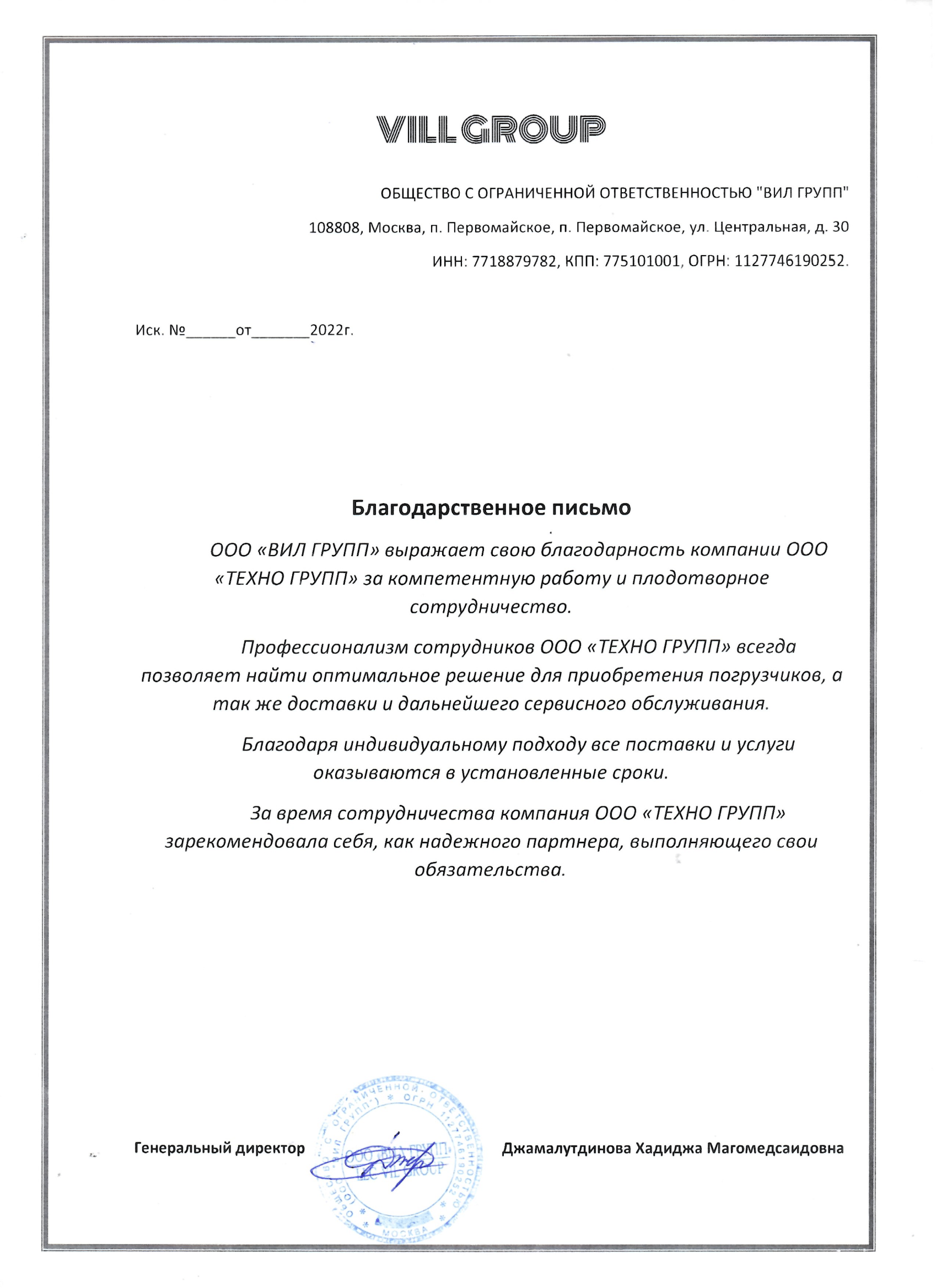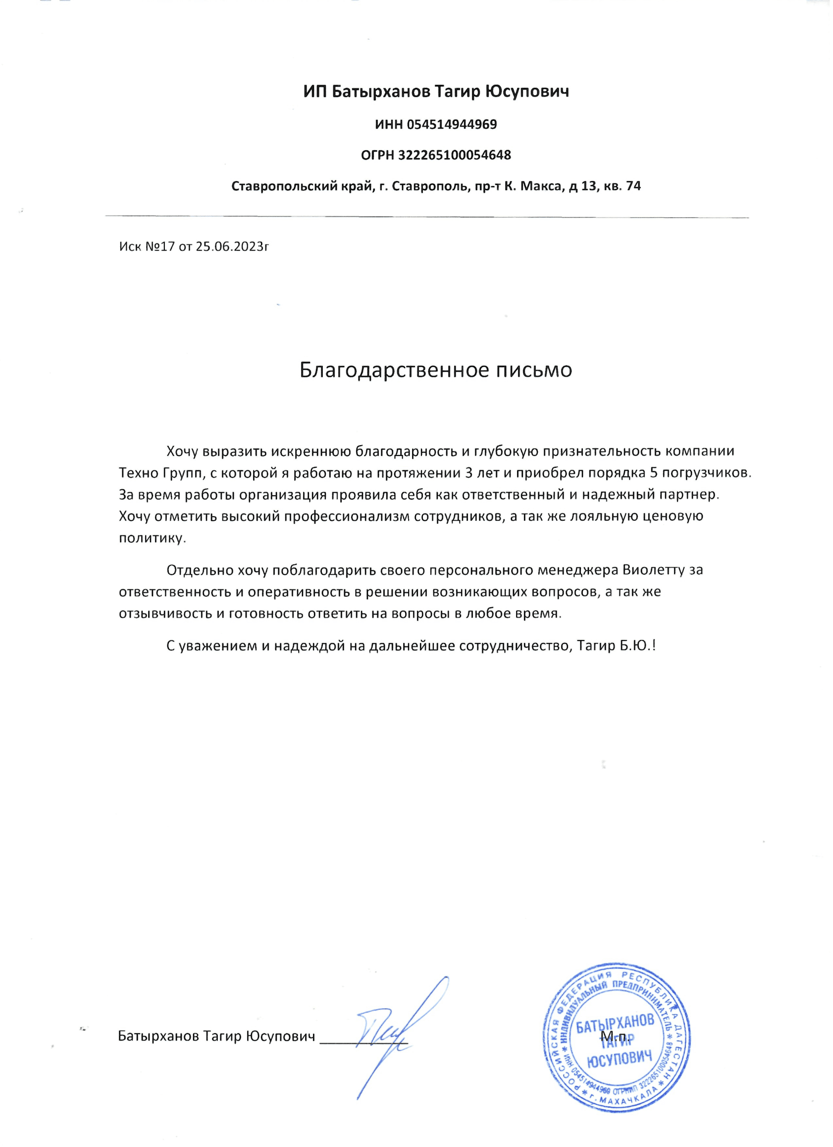 „ Хочу выразить признательность компании Техно Групп с которой я на протяжении 3 лет и приобрел порядка 5 погрузчиков. Организация проявила себя как надежный партнёр. Хочу отметитьвысокий профессионализм сотрудников, а так желояльную ценовую политику“