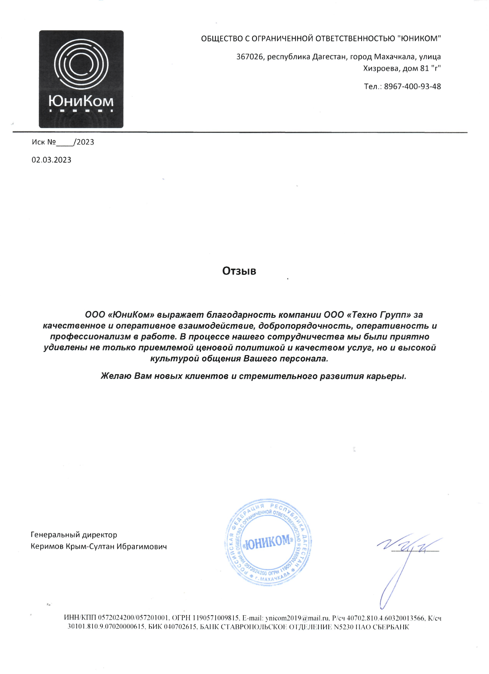„ Компания «Техно Групп» выполнила взятый на себя обязательства на высоком уровне, зарекомендовала себя как надежный поставщик, четко выполняющий условия работы и идущий навстречу интересам“